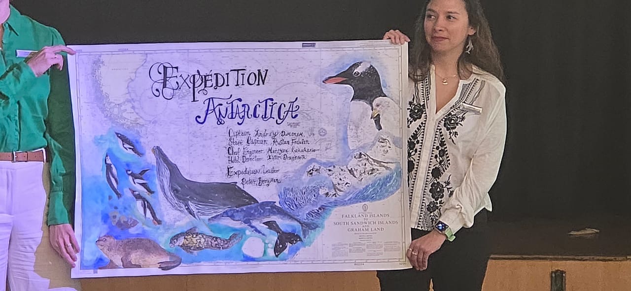 At 6 p.m. we will be heading into the Explorer lounge for the last time for the farewell from our Expedition Team. One of the expedition team members is an artist and she drew a beautiful picture on a voyage chart and it was auctioned off for a lot of money. The money went to the crew fund.