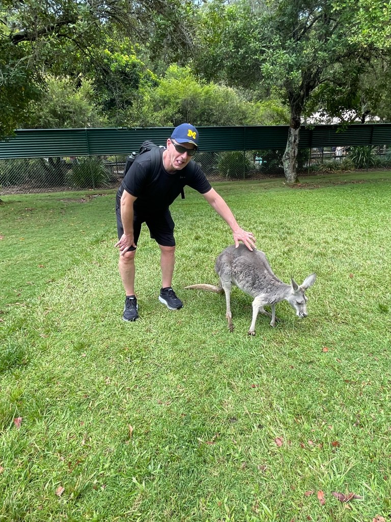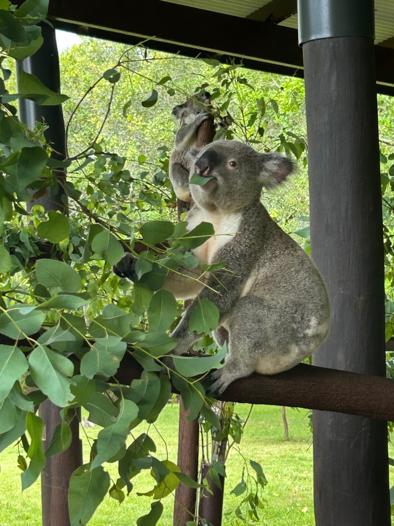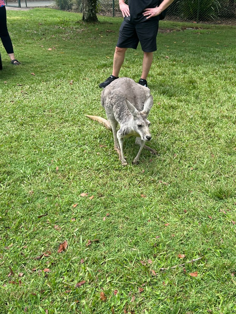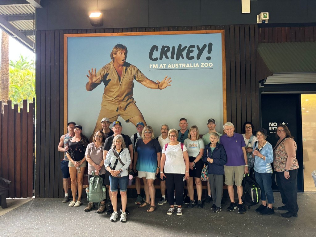 This morning was day one of our tour. It was hot and overcast and rained on and off most of the day. It did not get in our way of a great day. We hopped on a nice, air conditioned coach bus and headed north to the Sunshine Coast where we went to the Australia Zoo.