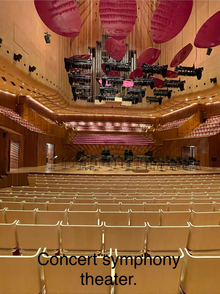When there is an Opera, no mics are necessary because the acoustics are so great that they dont need any. The ceiling is in the shape of a shell or the shape of the top of your mouth, with bumps and all. Every seat is the same and the sound reflects the same.